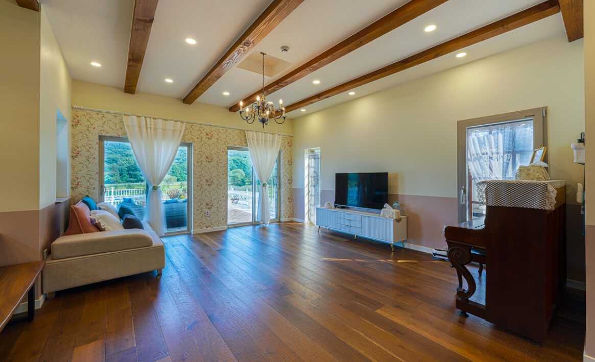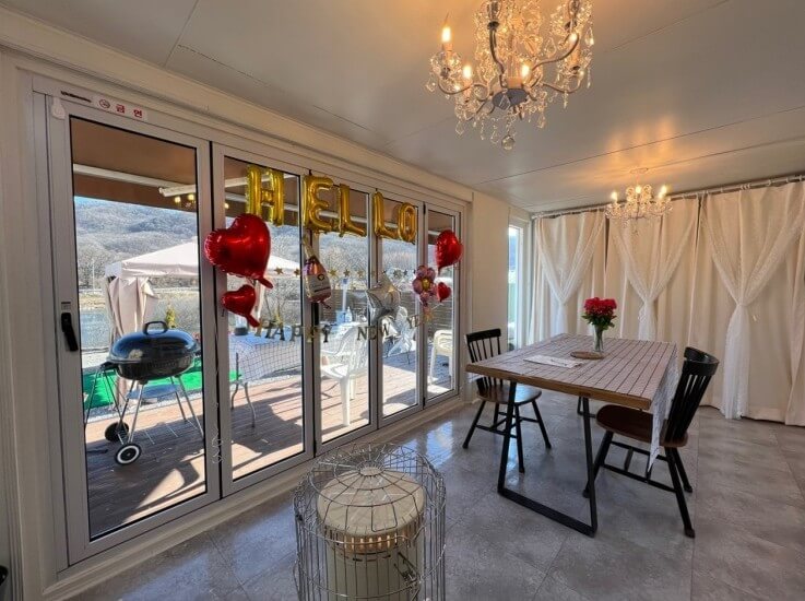 - 1층 : 거실 , 주방 , 방 4개 (침대 1 / 온돌 2 / 복층 1 / 드레스룸) , 화장실 2 , 테라스 , 베란다 , 개별 바비큐