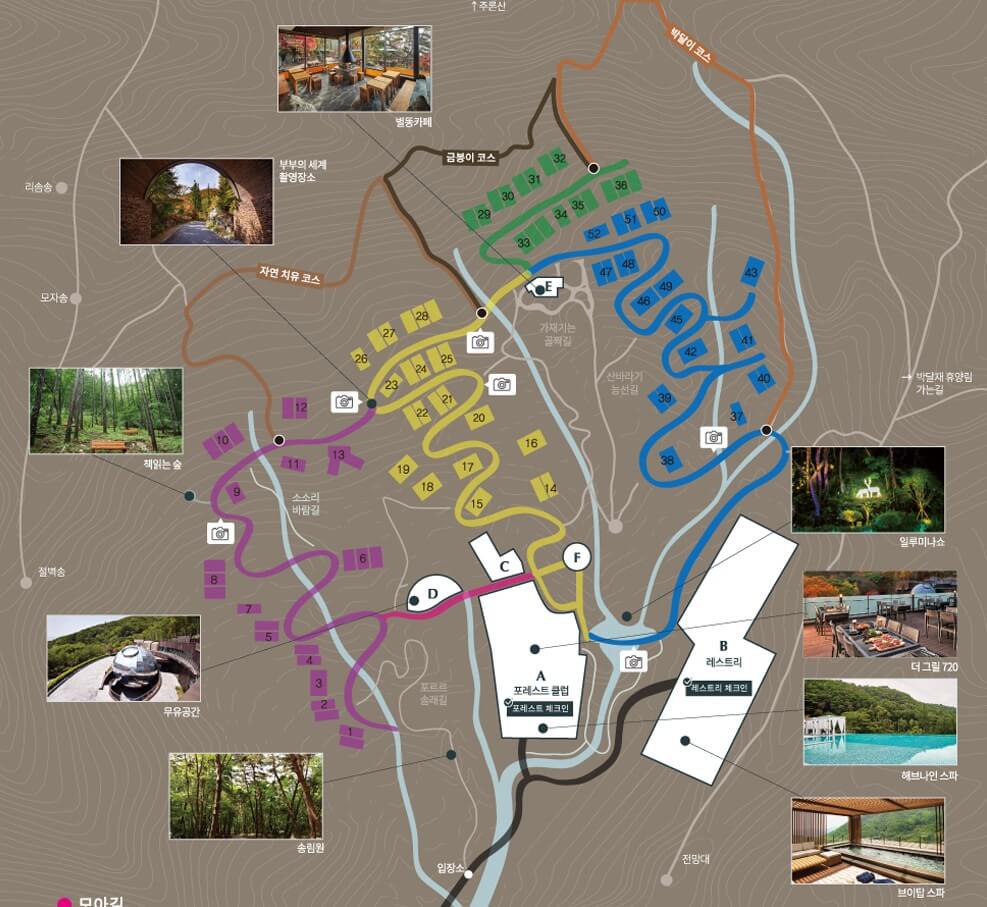 : 울창한 원시림의 아름다운 사계를 즐길 수 있는 친환경 리조트입니다. 구학산 , 주론산에 아늑하게 안겨 있는 분지형 구조이며 숲에서 뿜어져 나오는 음이온과 피톤치드가 지친 몸과 마음을 힐링하실 수 있는 리조트입니다.